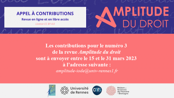 La revue en ligne "Amplitude du droit", éditée par l'IODE, lance un appel à contributions pour la publication de son numéro 3. Les contributions sont à envoyer entre le 15 et le 31 mars 2023.