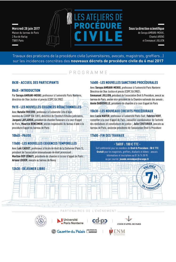L'association Droit & Procédure, l'Université de Nanterre et la Cour d'appel de Paris organisent avec la Gazette du Palais les premiers ateliers de procédure civile pour éclairer les praticiens sur les nouveaux décrets de procédure civile du 6 mai dernier