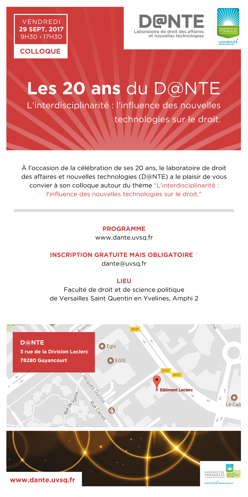A l'occasion de la célébration de ses 20 ans, le laboratoire de droit des affaires et des nouvelles technologies (D@NTE) a le plaisir de vous convier à son colloque : "L'interdisciplinarité : l'influence des nouvelles technologies sur le droit"