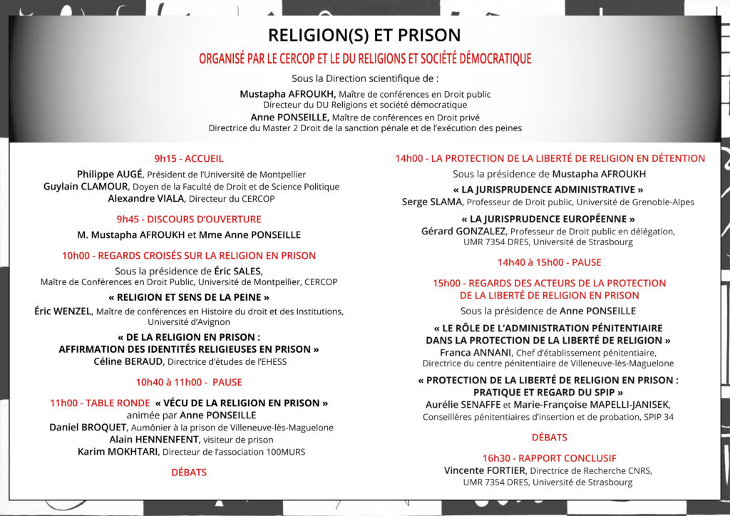 Organisé par le CERCOP, le CU Religions et sté démocratique, sous la dir. Sc. de Mustapha Afroukh, MCF en Droit public Dir. du DU Religions et sté démocratique, et Anne Ponseille, MCF en Droit privé Dir. du M2 sanction pénale et de l'exécution des peines.