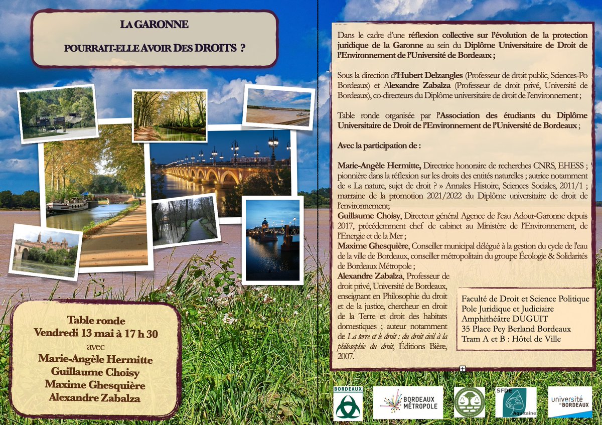 Cet événement s’inscrit dans le cadre d’une réflexion collective sur l’évolution de la protection juridique de la Garonne au sein du Diplôme Universitaire de Droit de Environnement de l'Université de Bordeaux, sous la direction d’Hubert Delzangles, Professeur de droit public, Sciences-Po Bordeaux et Alexandre Zabalza, Professeur de droit privé, Université de Bordeaux), co-directeurs du Diplôme universitaire de droit de l'environnement.