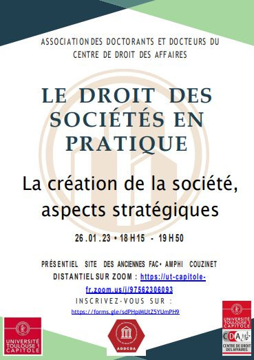 Organisée dans le cadre du cycle de conférences "Le droit des sociétés en pratique" de l'ADDCDA - Association des doctorants et docteurs du Centre de Droit des Affaires (CDA) - Université Toulouse 1 Capitole sous la direction scientifique de Madame Claire Despres, Doctorante ATER en droit privé du Centre de Droit des Affaires de l'Université Toulouse I Capitole, Présidente de l'ADDCDA