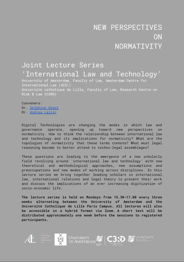 2023 sees the launch of a new joint-lecture series between ACIL and the Research Centre on Risk & Law C3RD at the Université Catholique Lille. The Series will be inquiring into the emergence of a new scholarly field revolving around ‘International Law and Technology’ with its theoretical and methodological approaches, its assumptions and preoccupations and new modes of working across disciplines. It will bring together leading scholars in international law, international relations and legal theory to present their work and discuss the implications of an ever increasing digitization of socio-economic life.