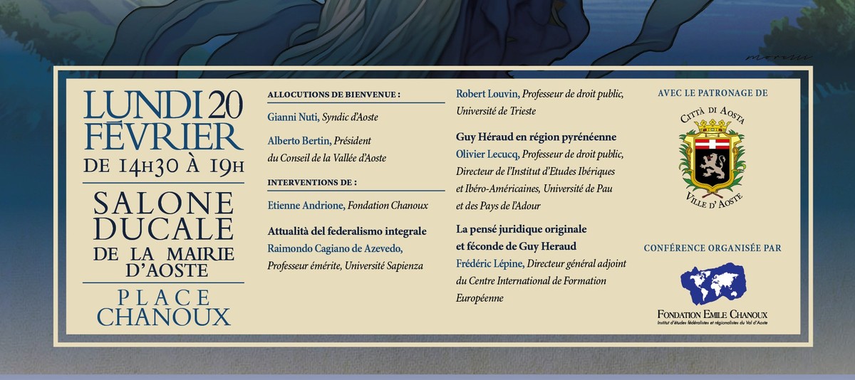 Pour rappeler ce moment marquant de l’histoire culturelle de la Vallée d’Aoste, le colloque prévoit l’intervention de M. Etienne Andrione, de la Fondation Chanoux, des Mm. Raimondo Cagiano de Azevedo, Professeur émérite de l’Université de la Sapienza de Rome, des professeurs Robert Louvin, de l’Université de Trieste, et Olivier Lecucq, de l’Université de Pau, ainsi que de M. Frédéric Lépine, Directeur général adjoint du C.I.F.E.