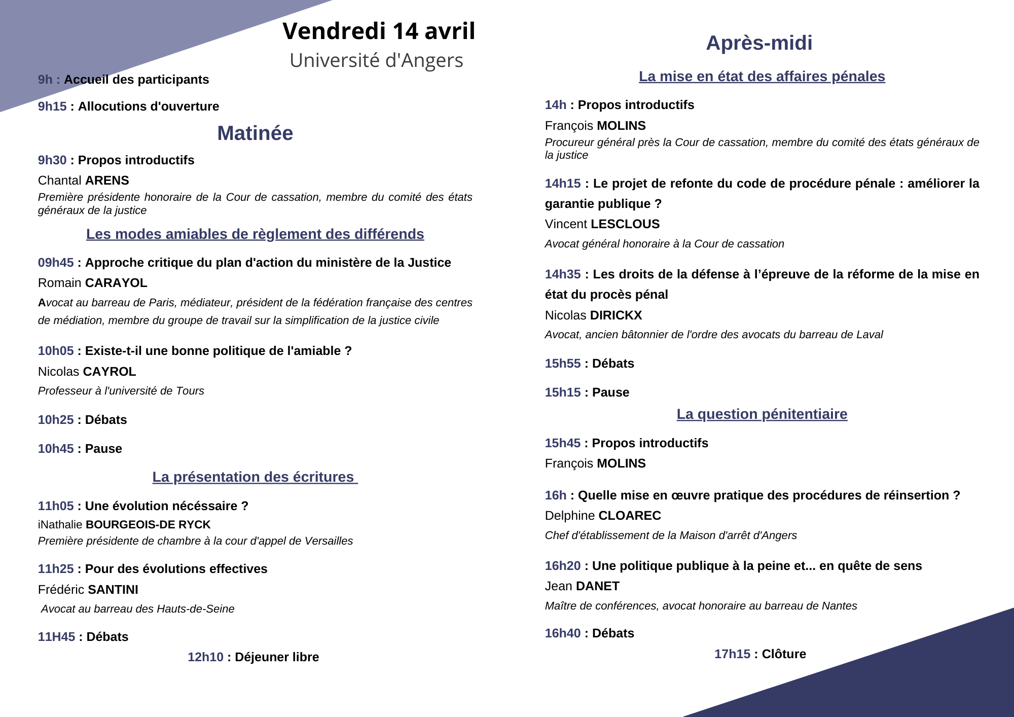 Une diversité de professionnels du droit interviendra sur quatre thèmes, en lien direct avec les enseignements suivis par les étudiants : la question de la présentation des écritures, des modes amiables de règlement des différends, de la mise en état des affaires pénales et la question pénitentiaire seront au cœurs des débats, qui ne manqueront pas d’être passionnants.