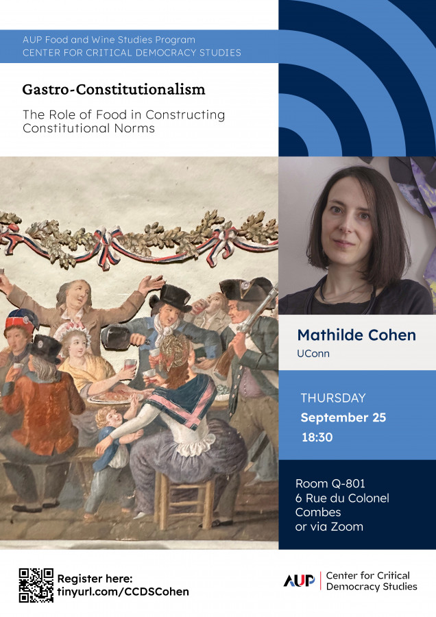 This presentation proposes the concept of "gastro-constitutionalism" (and more broadly of "gastro-legalism") to articulate the role of food in constructing constitutional norms and, reciprocally, the role of law in shaping eating practices. Far from marginal, the issue of what we eat, how our food is produced, by whom, and whether it is sustainable are defining features of our time. In an era marked by ecological crisis, social fragmentation, and rising authoritarianism, gastro-constitutionalism offers a framework for thinking about the role of law—starting from the belly. First, it introduces the concept to address a central question of the Anthropocene: how can we feed ourselves justly and sustainably while preserving the democratic values embedded in Constitutions ? Second, it investigates the role of alimentary beliefs and practices in the establishment of constitutional principles that in turn impact the food system and its sustainability. The argument builds upon the sociological literature on the related notions of "gastro-politics," "gastro-nationalism," and "gastro-diplomacy." These ideas have been offered to conceptualize the use of food to advance ideas about what defines a community and who belongs or does not belong to it. Indeed, eating is an essential activity all humans must engage in on a daily basis, but it is also a powerful ideological practice that grounds social interactions, policies, and conflicts. My project centers on the interaction between eating and Constitutions, drawing on examples from various socio-legal contexts, but primarily drawn from France and the United States.