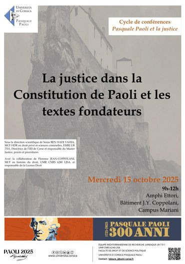 Cycle de conférences "Pasquale Paoli et la justice" - Tricentenaire organisé par l'EMRJ, Université de Corse sous la direction scientifique de Sonia Ben Hadj Yahia, MCF HDR en droit privé et sciences criminelles, EMRJ UR 7311, Directrice de l’IEJ de Corse et responsable du Master Justice, Procès et Procédure