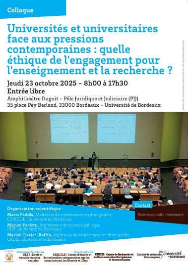 Colloque organisé sous la direction scientifique de Marie Padilla, Marion Paoletti et Marion Tissier-Raffin, avec le soutien de la Fondation Mainguené et du département DETS, ainsi que du CERCCLE, du CRDEI, et de l'IRM, Université de Bordeaux