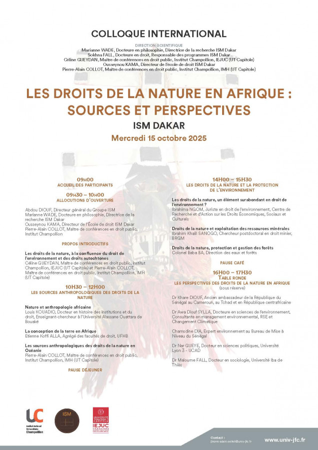 Colloque international organisé par L'INU Champollion sous la direction scientifique de Marianne Wade, Dr en philosophie, Directrice de la recherche ISM Dakar ; Sokhna Fall, Dr en droit, Responsable des programmes ISM Dakar ; Céline Gueydan, MCF en droit public, Institut Champollion, IEJUC (UT Capitole) ; Ousseynou Kama, Directeur de l’école de droit ISM Dakar et Pierre-Alain Collot, MCF en droit public, Institut Champollion, IMH (UT Capitole)