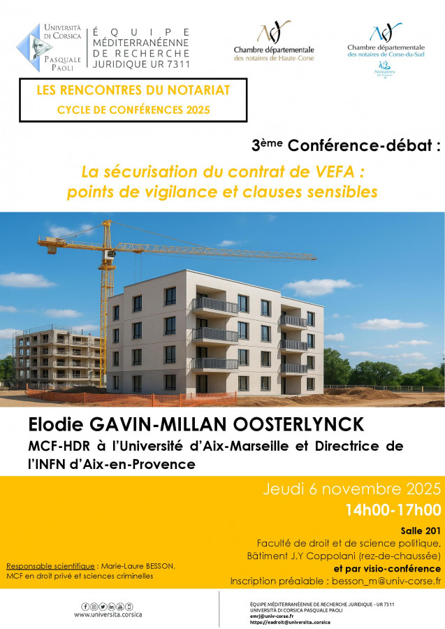 Conférence organisée par l'EMRJ, Université de Corse dans le cadre des "Rencontres du notariat" sous la direction scientifique de Mme Marie-Laure Besson