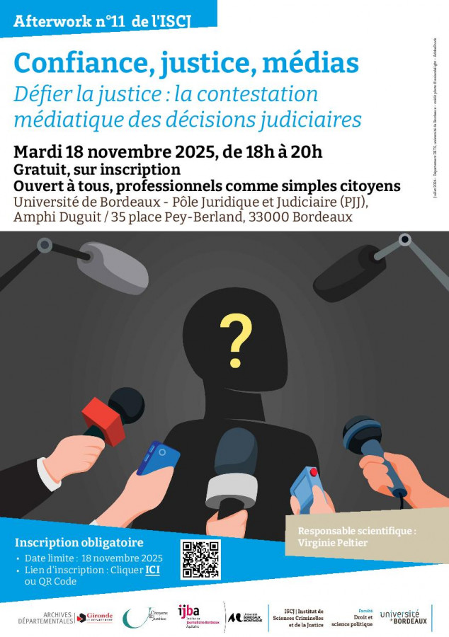 Afterwork n°11 organisé par l'ISCJ, Université de bordeaux sous la responsabilité scientifique de Virginie Peltier, Professeur de droit privé et sciences criminelles dans le cadre de son cycle de conférences « Confiance, justice, médias »