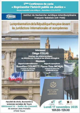 Conférence organisée par Institut de Recherche Juridique Interdisciplinaire François-Rabelais (UR-7496) - IRJI, Université de Tours dans le cadre du cycle "Représenter l’intérêt public en Justice" sous la responsabilité scientifique de Romélien Colavitti