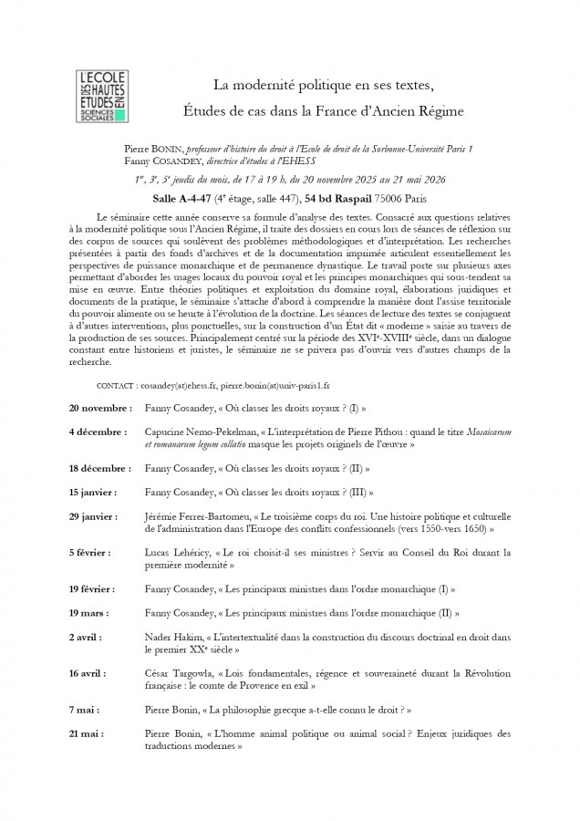 Le séminaire cette année conserve sa formule d’analyse des textes. Consacré aux questions relatives à la modernité politique sous l’Ancien Régime, il traitera des dossiers en cours lors de séances de réflexion sur des corpus de sources qui soulèvent des problèmes méthodologiques et d’interprétation. Les recherches présentées à partir des fonds d’archives et de la documentation imprimée articuleront essentiellement les perspectives de puissance monarchique et de permanence dynastique. Le travail porte sur plusieurs axes permettant d’aborder les usages locaux du pouvoir royal et les principes monarchiques qui sous-tendent sa mise en œuvre. Entre théories politiques et exploitation du domaine royal, jurisconsultes et documents de la pratique, le séminaire s’attache d’abord à comprendre la manière dont l’assise territoriale du pouvoir alimente ou se heurte à l’évolution de la doctrine. Les séances de lecture des textes se conjugueront à d’autres interventions, plus ponctuelles, sur la construction d’un État dit « moderne » saisie au travers de la production de ses sources, en particulier la législation militaire et sa reconstruction historiographique. Principalement centré sur la période des XVIe-XVIIIe siècle, dans un dialogue constant entre historiens et juristes, le séminaire ne se privera pas d’ouvrir vers d’autres champs de la recherche.