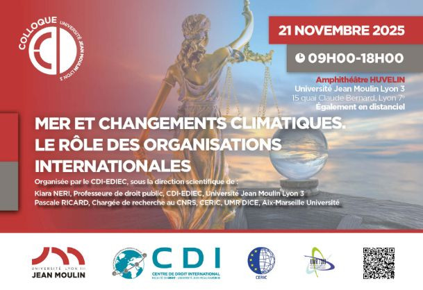 Colloque organisé par le CDI-EDIEC, le CERIC, l'UMR DICE, Faculté de droit, Université Lyon 3 dans le cadre du projet "Mer et changements climatiques", sous la direction scientifique de Kiara Neri, Professeure de droit public, CDI-EDIEC, Université Jean Moulin Lyon 3 et Pascale Ricard, Chargée de recherche au CNRS, CERIC, UMR DICE, Université Aix-Marseille