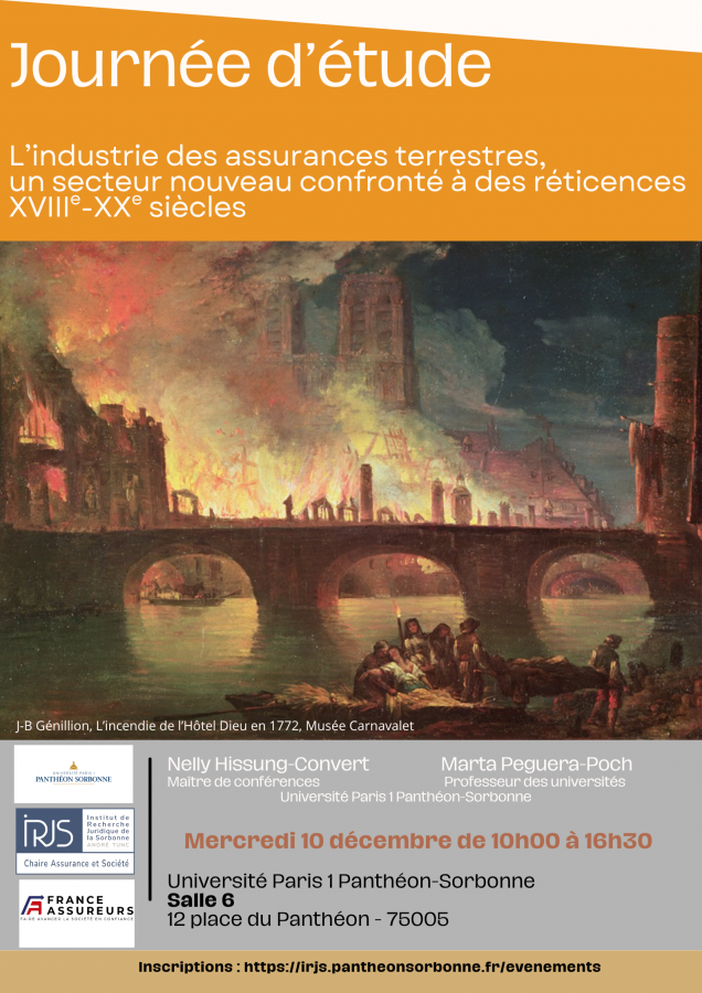 La journée d'étude "L'industrie des assurances terrestres, Un secteur nouveau confronté à des réticences XVIIIe-XXe siècles", organisée à l'université Paris 1 Panthéon-Sorbonne dans le cadre de la chaire Assurance et Société, Historicité des savoirs et pratiques de l'interdisciplinarité, vise à étudier, dans une perspective d'histoire du droit, comment naît, se développe et s'enracine la société d'assurances.