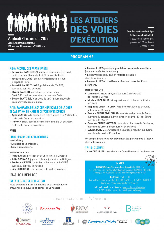 Ateliers organisés par Droit et procédures, la Cour d'appel de Paris, SciencesPo, l'ENM, Le Barreau de Paris, le Conseil National des Barreaux, les Commissaires de Justice, l'AAPPE, la Gazette du Palais et l'UIHJ sous la direction scientifique de Soraya Amrani-Mekki, Agrégée des facultés de droit, Professeure à l’École de droit Sciences Po Paris