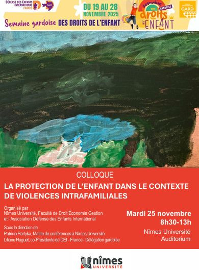 A l'occasion de la semaine gardoise des droits de l'enfant, qui se tiendra du 19 au 28 novembre, Nîmes Université et l’Association Défense des enfants International - France coorganisent le colloque : « La protection de l’enfant dans le contexte de violences intrafamiliales ». Cette manifestation se déroule sous la direction de Patricia Partyka, Maître de conférences en Droit privé à Nîmes Université et de Liliane Huguet, co-Présidente de DEI – France, délégation gardoise. Sont directement associés à la journée, les étudiants du Master Enseignement Clinique du Droit des Affaires et les étudiants « Éducateurs jeunes enfants » de l’IFME.