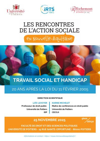 Colloque organisé par la faculté de droit, Université de Poitiers, l’Institut Régional du Travail Social Poitou-Charentes et l’Institut de Richemont sous la direction scientifique du Pr. Loïc Levoyer, Professeur de droit public, Université de Poitiers, IDP et Karine Michelet, MCF en droit public, Université de Poitiers, CECOJI