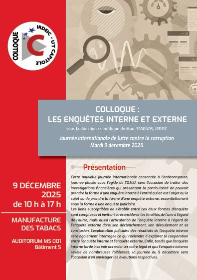 Cette nouvelle journée internationale consacrée à l’anticorruption, journée placée sous l’égide de l’O.N.U, sera l’occasion de traiter des investigations financières qui présentent la particularité de pouvoir prendre la forme d’une enquête interne à l’entité qui en est l’objet ou le sujet ou de prendre la forme d’une enquête externe, essentiellement sous la forme d’une enquête judiciaire.