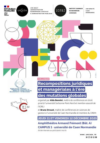 Colloque organisé par l’Association Française Droit et Management (AFD&M) avec l'ICREJ, Université de Caen sous la direction scientifique d'Aïda Bennini, MCF en droit privé à l'Université Sorbonne Paris Nord et membre associé de l’ICREJ et Bruno Drouot, MCF en sciences de gestion à l'Université de Caen Normandie et membre du CREM
