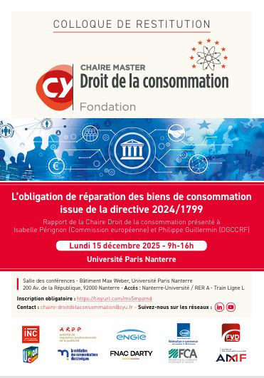 La Chaire Droit de la consommation a consacré son deuxième travail de recherche à l’obligation de réparation des biens de consommation. Ce rapport analyse la pertinence de cette obligation juridico-économique à l’aune de la directive (UE) 2024/1799 du 13 juin 2024 « établissant des règles communes visant à promouvoir la réparation des biens et modifiant le règlement (UE) 2017/2394 et les directives (UE) 2019/771 et (UE) 2020/1828 (Texte présentant de l’intérêt pour l’EEE) ». À l’occasion de son colloque de restitution du 15 décembre 2025, la Chaire présentera et discutera ses propositions (transposition de la directive, résolution des difficultés d’articulation de la directive avec les textes existants etc.), en présence d’Isabelle Pérignon, en charge de la politique des consommateurs à la DG Justice de la Commission européenne et de Philippe Guillermin, chef du bureau droit de la consommation de la DGCCRF.