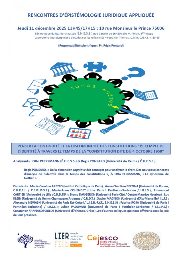 Rencontres d’épistémologie juridique appliquée organisées avec le soutien du Laboratoire interdisciplinaire d’études sur les réflexivités – Fond Yan Thomas, U.M.R. C.N.R.S. n°80-65, sous la responsabilité scientifique du Pr. Régis Ponsard