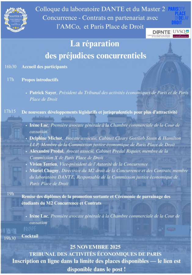 Conférence annuelle organisée par le Master 2 Droit de la Concurrence et des Contrats, dirigé par Madame le professeur Muriel Chagny, avec le DANTE, USVQ