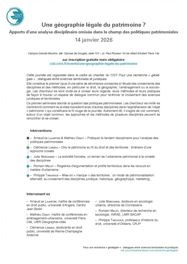 Cette journée est organisée dans le cadre du chantier du CIST Pour une recherche « géolégale » : dialogues entre sciences territoriales et juridiques.