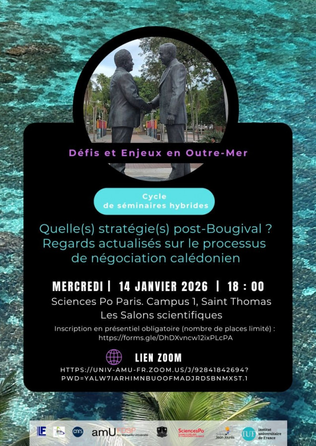 Alors que les négociations sur l'avenir institutionnel calédonien reprennent, tirant les conséquences du rejet de l'accord de Bougival par le FLNKS, le séminaire propose de porter un regard actualisé sur le processus politique en cours, en croisant les regards de trois chercheurs spécialistes de la Nouvelle-Calédonie qui apporteront leur expertise disciplinaire pour analyser les ressorts et enjeux du processus de décolonisation dans le contexte "Post-Bougival".