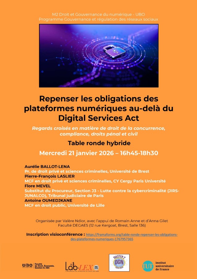Table ronde hybride organisée par Valère Ndior, avec l'appui de Romain Anne et d'Anna Gilet, dans le cadre du Programme Gouvernance et régulation des réseaux sociaux et du M2 Droit et Gouvernance du numérique.