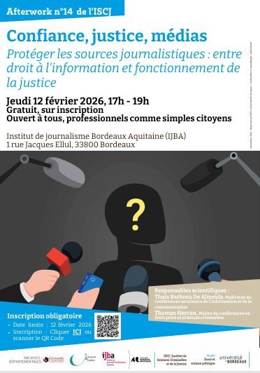 Dans le cadre de son cycle de conférences "Confiance, justice, médias", l’ISCJ propose plusieurs afterworks en 2025-2026, à destination de tous. L’occasion de croiser les regards du chercheur en droit pénal, d’un praticien issu du monde judiciaire et d’un spécialiste de la communication.
