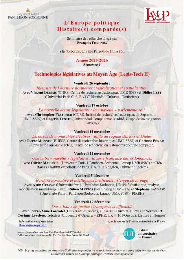 Séminaires organisés par le LAMOP, Université Paris 1 Panthéon-Sorbonne avec l'IUF dirigé par François Foronda