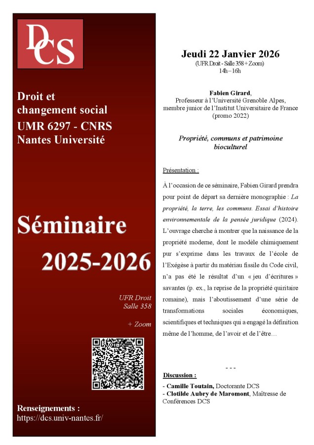 Plus d'infos : https://dcs.univ-nantes.fr/fr/manifestations-scientifiques/seminaire-general-droit-et-changement-social-2025-2026-fabien-girard