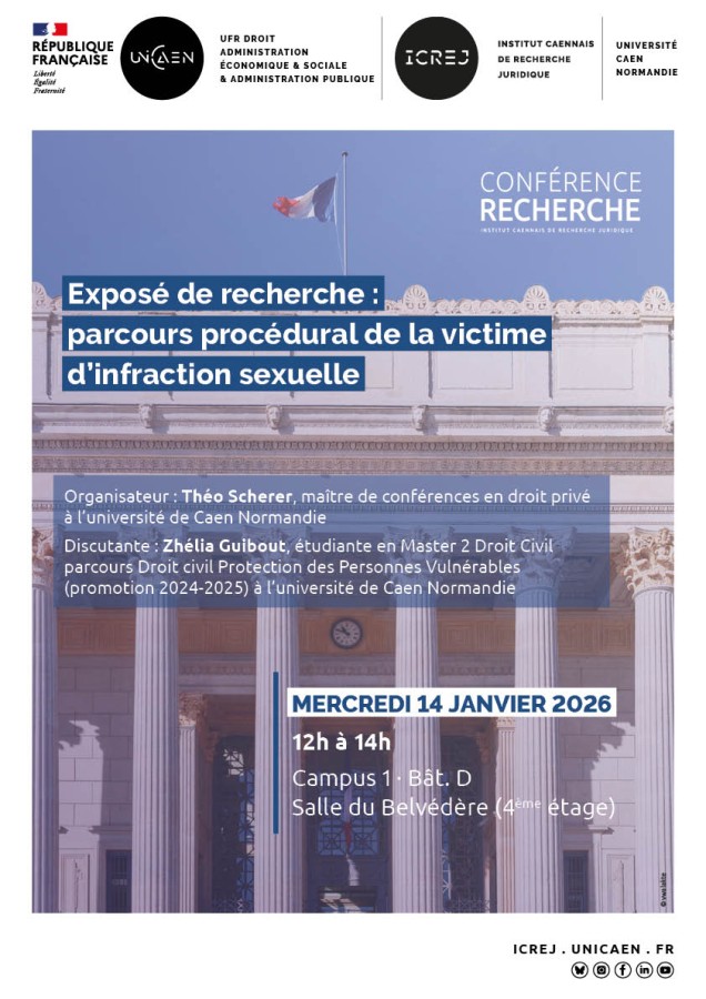 Inscription gratuite mais obligatoire : https://icrej.unicaen.fr/evenement/expose-de-recherche-le-parcours-procedural-de-la-victime-dinfraction-sexuelle/