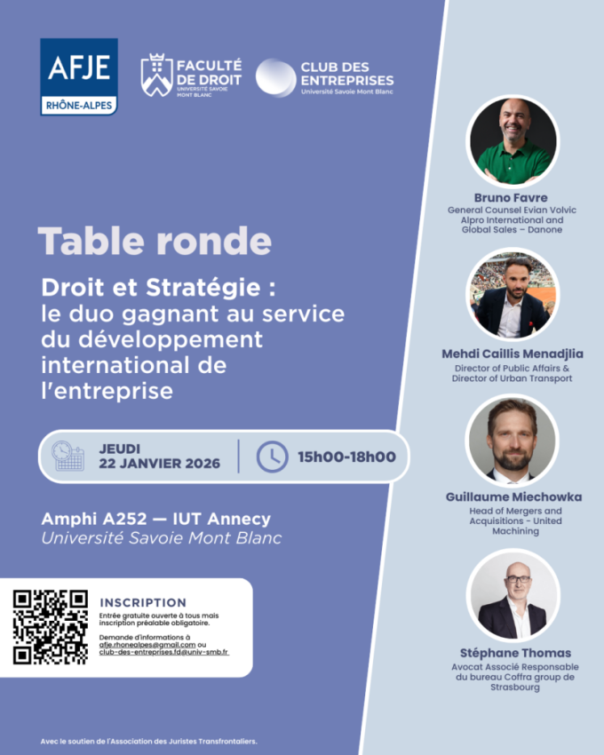 Table ronde organisée par la faculté de droit, Université Savoie-Mont Blanc en partenariat avec la Délégation AFJE Rhône-Alpes, son Antenne des 2 Savoie et le Club des Entreprises
