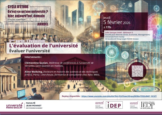 Conférence organisée par l'IEDP, IDEP, Faculté Jean Monnet, Université Paris-Saclay dans le cadre du cycle d’étude annuel "Qu’est-ce qu’une université ? hier, aujourd’hui, demain" 5ème partie : L’évaluation, sous la direction scientifique de Charles Vautrot-Schwarz et Marc-Olivier Barbaud