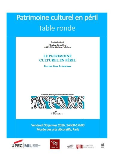 À l’occasion de la sortie de l’ouvrage "Le patrimoine culturel en péril – État des lieux et solutions", le MIL (Université Paris Est Créteil) et le CRJ Pothier (Université d’Orléans) ont le plaisir de vous convier à une table ronde réunissant des contributeurs, des acteurs du patrimoine et des chercheurs.
