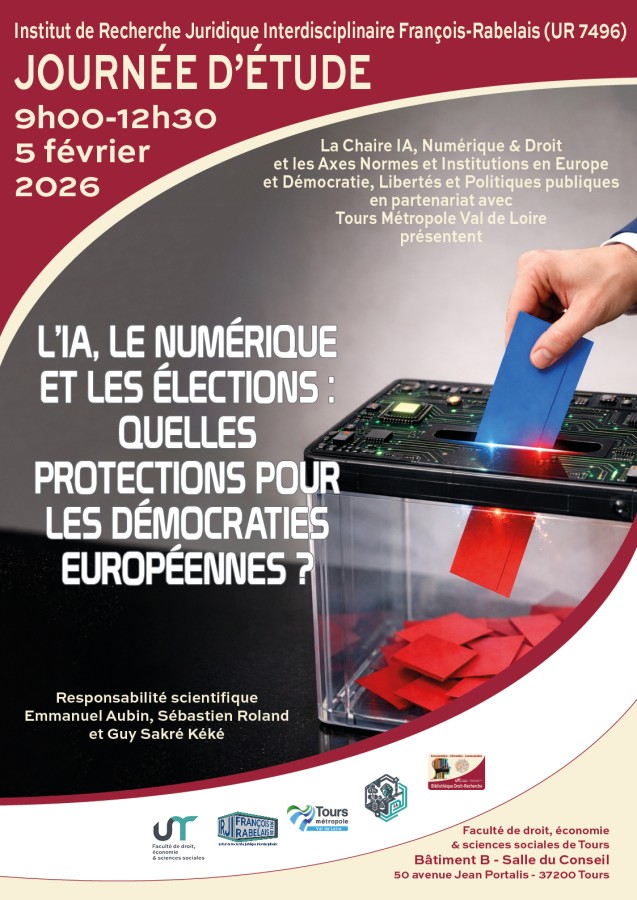Journée d'études organisée par la Chaire IA, Numérique & Droit et les Axes Normes et Institutions en Europe et Démocratie, Libertés et Politiques publiques en partenariat avec Tours Métropole Val de Loire sous la responsabilité scientifique d'Emmanuel Aubin, Sébastien Roland et Guy Sakré Kéké