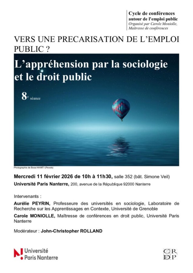 Le quatrième thème de ce cycle intitulé « vers une précarisation de l’emploi public ?» s’ouvre par une séance consacrée à la notion de précarité. Celle-ci propose un regard croisé de la sociologie et du droit public autour de la notion de précarité.