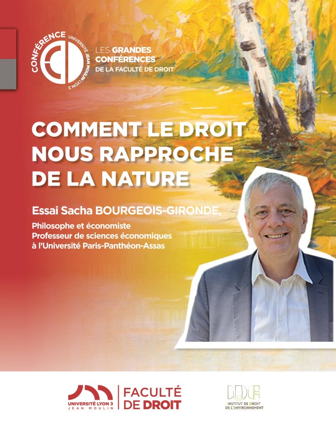 Conférence organisée dans le cadre des "Grandes Conférences de la Faculté de droit", Université Lyon 3 sous la direction scientifique de Philippe Billet, Professeur à l’Université Jean Moulin Lyon 3, Directeur de l'Institut de Droit de l'Environnement et Rémy Dufal, MCF à l’Université Jean Moulin Lyon 3, Directeur-adjoint de l'Institut de Droit de l'Environnement
