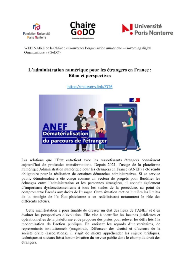Ce webinaire, organisé par la Chaire « Gouverner l’organisation numérique – Governing Digital Organizations » (GoDO), a pour objectif de dresser un état des lieux critique de l’ANEF, d’en analyser les lacunes juridiques et opérationnelles et d’explorer les perspectives d’évolution de ce dispositif. En croisant les regards d’universitaires, de représentants institutionnels (magistrats, Défenseur des droits) et d’acteurs de la société civile, la rencontre permettra d’appréhender les enjeux juridiques, techniques et sociaux liés à la numérisation du service public dans le champ du droit des étrangers.