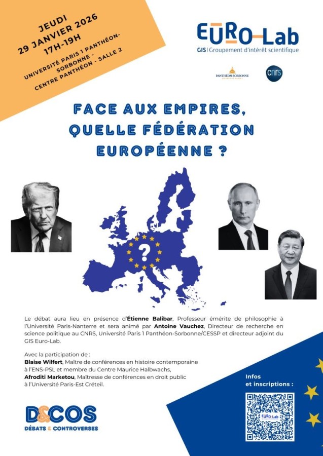 Cette nouvelle édition des Débats & Controverses du GIS Euro-Lab s’interrogera sur l’actualité de la question fédérale européenne à l’aune du nouveau contexte géopolitique et géoéconomique marqué par une bascule impériale et une rivalité croissante des puissances. En repartant d’un texte récent d’Étienne Balibar intitulé « L’impossible possibilité de la fédération européenne », on examinera avec l’auteur les nouvelles raisons d’être d’une solution fédérale européenne en même temps qu’on interrogera les conditions de possibilité d’un tel développement.