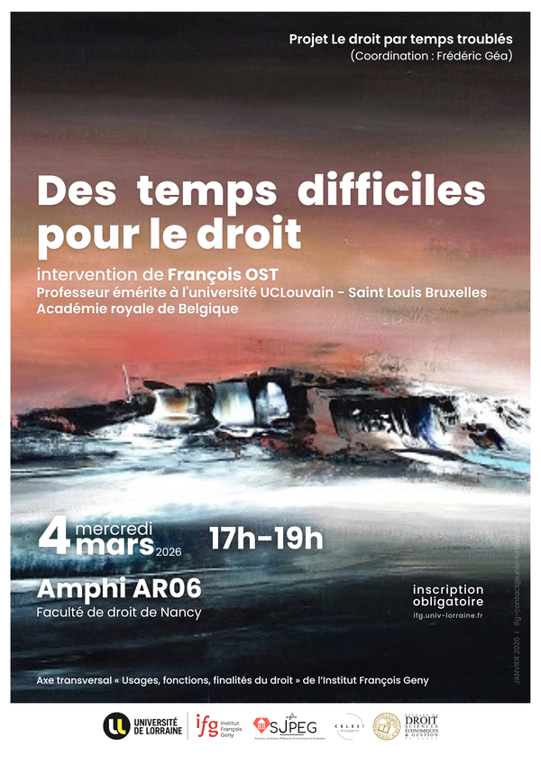 Juriste et philosophe, François Ost est membre de l’Académie royale de Belgique et professeur émérite de l’UCLouvain (Saint-Louis) et de l’Université de Genève. Fondateur de l’Académie européenne de théorie du droit, il est l’auteur d’une trentaine d’ouvrages en théorie et philosophie du droit ; beaucoup d’entre eux ont fait l’objet de traductions en langues étrangères. Président de la Fondation pour les générations futures, il est aussi l’auteur de pièces de théâtre et de contes juridiques. Son prochain ouvrage, à paraître au premier trimestre 2026, s’intitule « Des temps difficiles pour le droit. A quoi sert le droit ?... dix ans plus tard » (Bruylant, coll. Penser le droit).