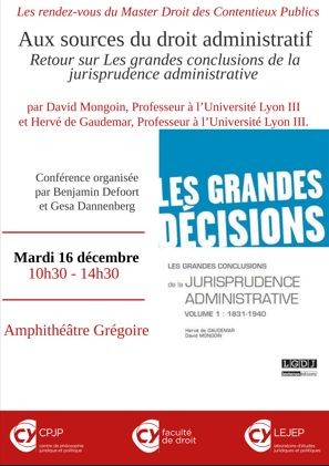 Une nouvelle conférence aura lieu cette année, le 16 décembre 2025, dans l’amphi Grégoire de la Faculté de droit (Chênes 1), et sera consacrée au premier volume des « Grandes conclusions de la jurisprudence administrative (vol. 1 : 1831-1940) », en présence des auteurs de l’ouvrage, Hervé de Gaudemar et David Mongoin, Professeurs de droit public à l’Université Lyon III.