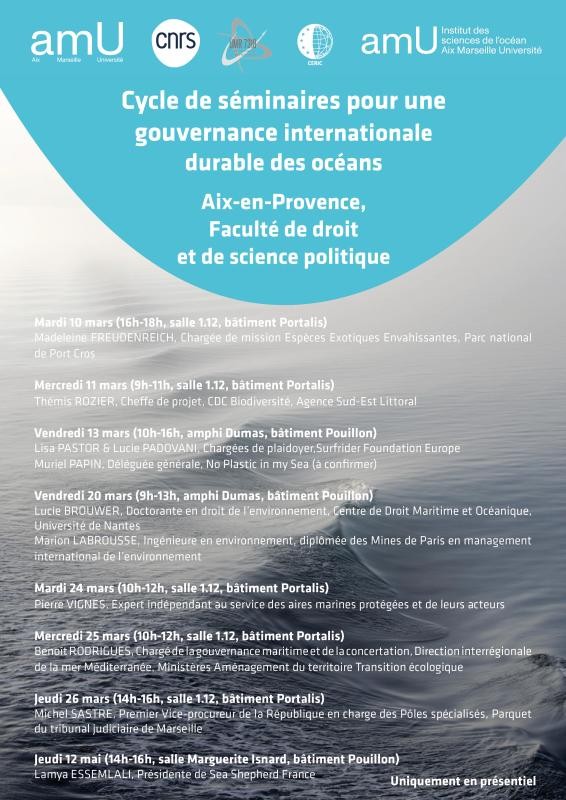 Cycle de conférences organisé par le CERIC, l'UMR DICE, Faculté de droit, Aix-Marseille Université ans le cadre du DESU Gouvernance internationale durable des océans, porté par Sophie Gambardella et Pascale Ricard, chargées de recherche CNRS