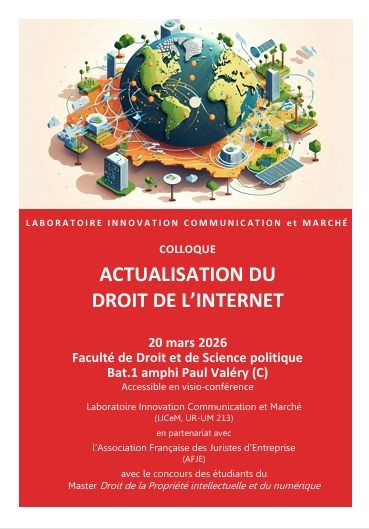 Colloque organisé par le Laboratoire Innovation Communication et Marché, en partenariat avec l’Association Française des Juristes d’Entreprise, en collaboration avec le Master droit de la propriété intellectuelle et du numérique, Faculté de droit, Université de Montpellier