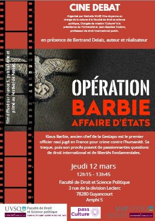 Ciné-débat organisé par Nathalie Wolff, vice doyenne en charge de la culture et chargée de mission "Culture" à la présidence de l'Université et Jean-Baptiste Dudant, professeur de droit international public, sur le film Opération Barbie, affaire d'états en présence de son auteur et réalisateur : Bertrand Delais.