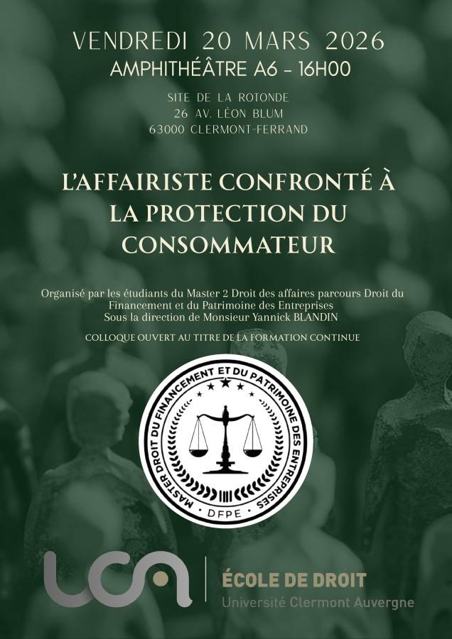 Colloque organisé par les étudiants du Master 2 Droit des affaires parcours Droit du Financement et du Patrimoine des Entreprises, Ecole de droit, Université de Clermont-Auvergne sous la direction de Monsieur Yannick Blandin