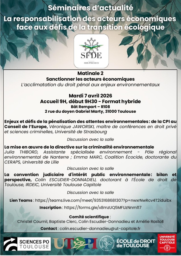 Matinale SFDE organisée par Sciences Po Toulouse, École De Droit De Toulouse, Université Toulouse Capitole dans le cadre du Séminaires d'actualité "La responsabilisation des acteurs économiques face aux défis de la transition écologique" sous la direction scientifique de Christel Cournil, Baptiste Clerc, Colin Escudier-Donnadieu et Amélie Rastoll