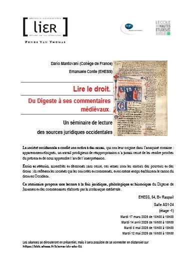 Ce séminaire propose une lecture à la fois juridique, philologique et historique du Digeste de Justinien et des commentaires élaborés par la scolastique médiévale.
